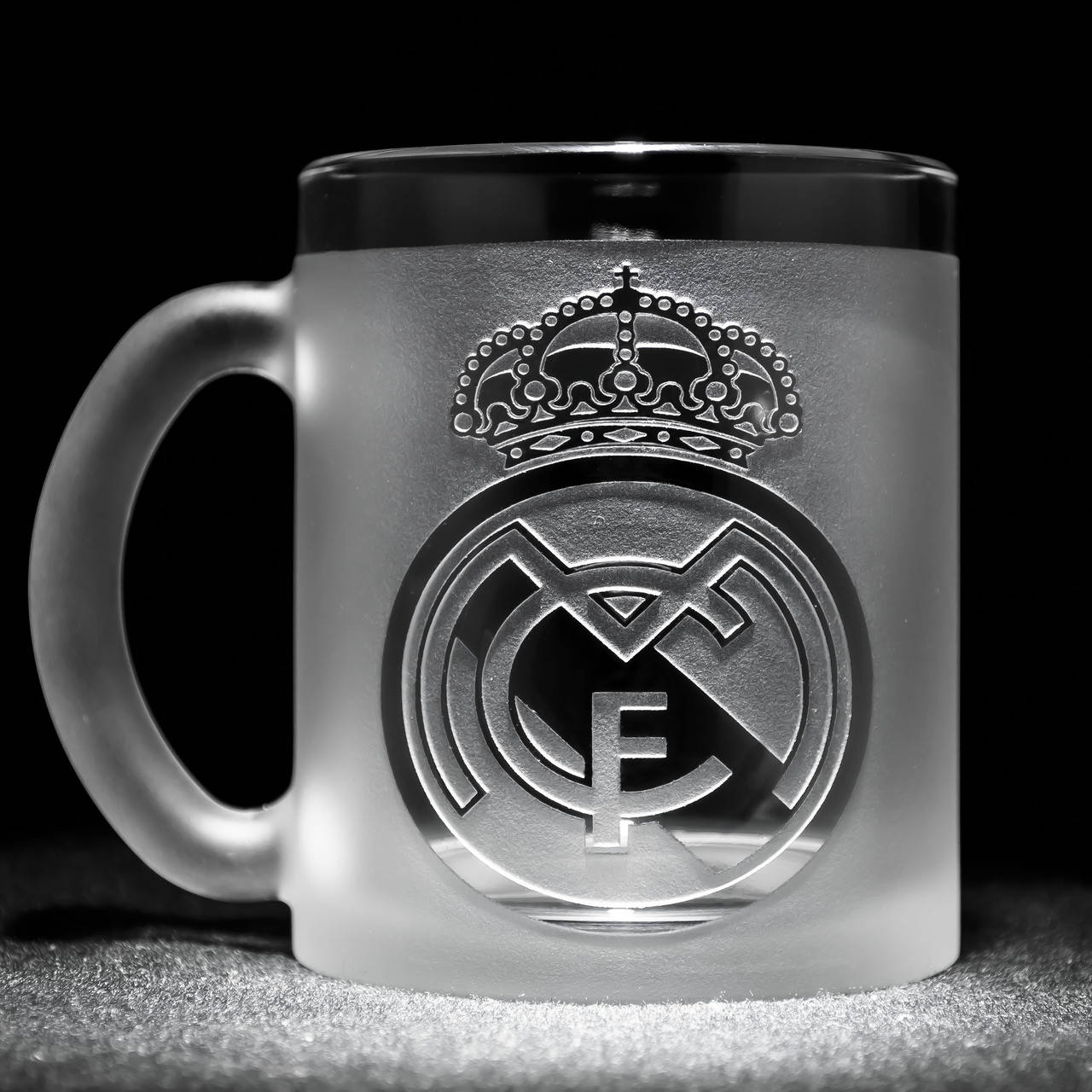 Стеклянная чашка с ручной механической гравировкой логотипа футбольного клуба Реал Мадрид FC Real Madrid 300 мл