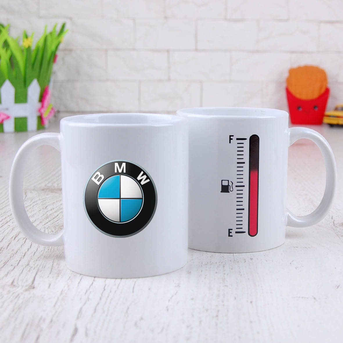 Очень классная чашка хамелеон "Заправка BMW " (Tank Up BMW) с логотипом автомобильного бренда БМВ. Чашка в обычном состоянии показывает черный уровень заправки, но когда добавить горячий напиток уровень кофе или чая становится красным.