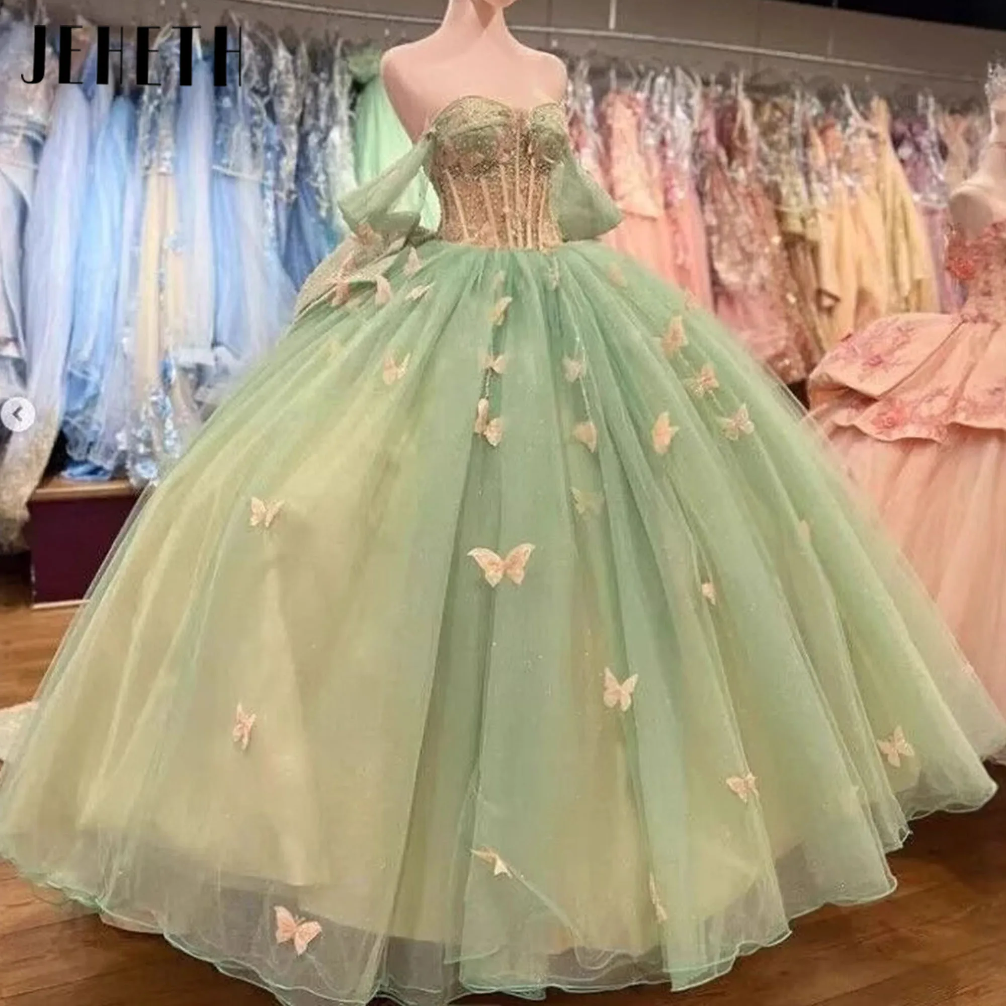 JEHETH Butterfly Appliqué Quinceanera Dress Sweetheart Long Train Adult Gown Corset Bow Shimmering Off Shoulder Evening Dress