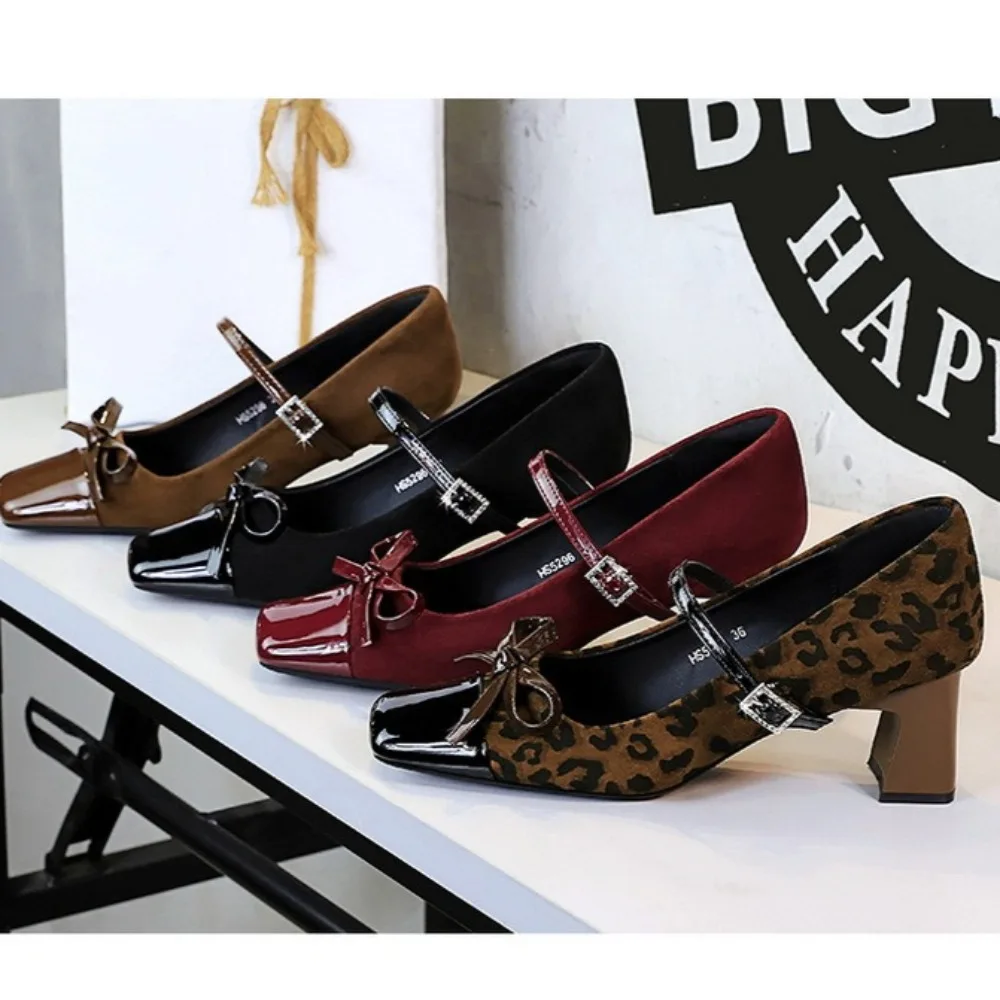 Деловые деловые женские туфли Мэри Джейн с леопардовым принтом, черно-коричневого цвета, двухцветные бархатные туфли с бантом и квадратным носком, низкие туфли Мэри Джейн на блочном каблуке