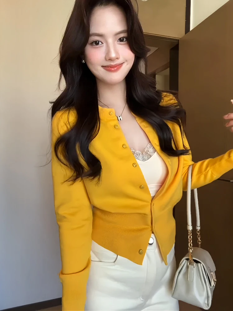 Women's autumn 2025 new sweater jacket design sense waist cinched short shoulder long sleeved solid knitted cardigan