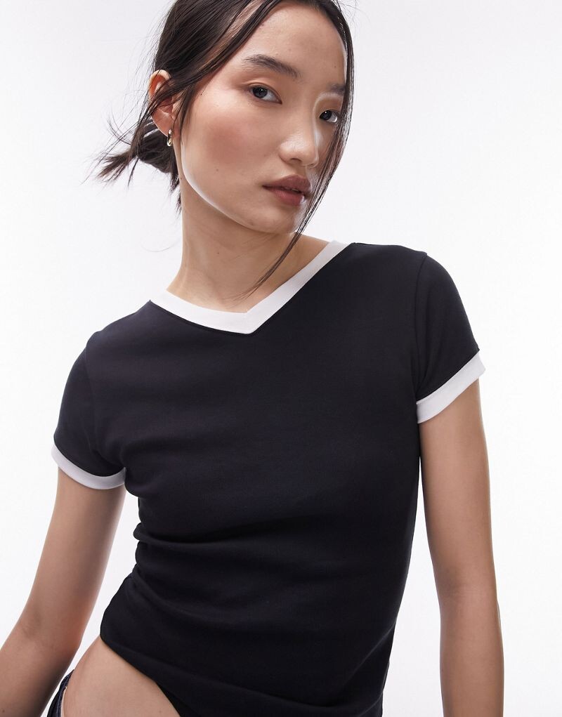 Топы TopshopДобро пожаловать в следующий этап Topshop!V-образный вырезКороткие рукаваКонтрастная отделкаОблегающий крой