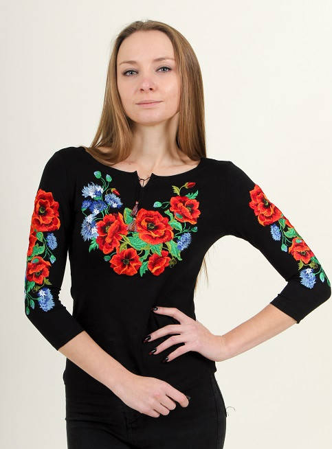 Черная футболка Вышиванка женская рукав три четверти, Черный