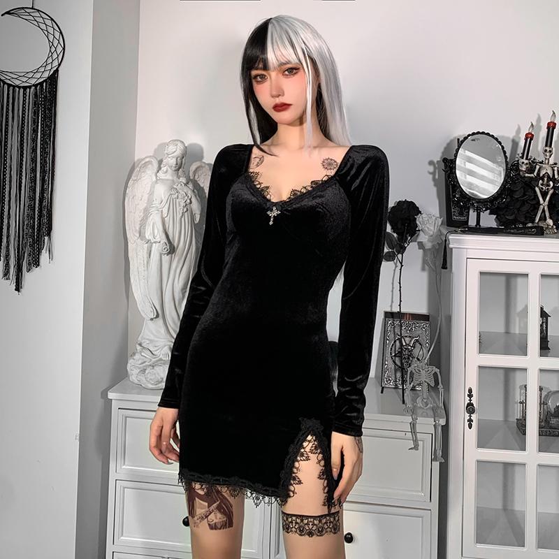 Черное мини-платье в готическом стиле в стиле ретро. Платье с высокой талией. Уличное платье. Вечернее платье с длинными рукавами. L чёрный