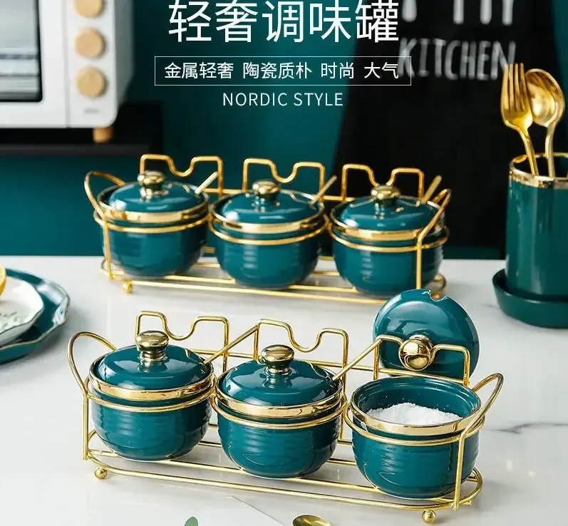 3pcs Art Ceramic Dark Green Seasoning Pot Luxury Phnom Penh Soy Sauce Vinegar Bottle with Shelf Household Chili Salt Sugar Bowl