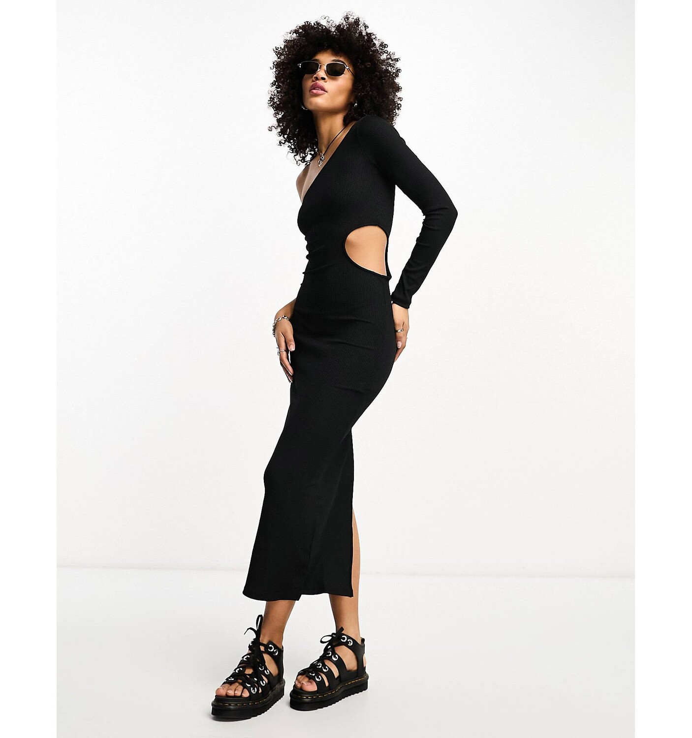 Черное платье макси с асимметричным вырезом и вырезом Bershka, Черный, Черное платье макси с асимметричным вырезом и вырезом Bershka