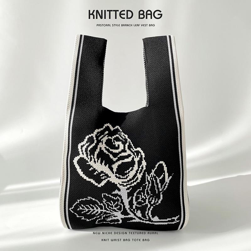 Черно-белая вязаная сумка через плечо с розами - модная большая вместительная сумка на запястье для женщин
