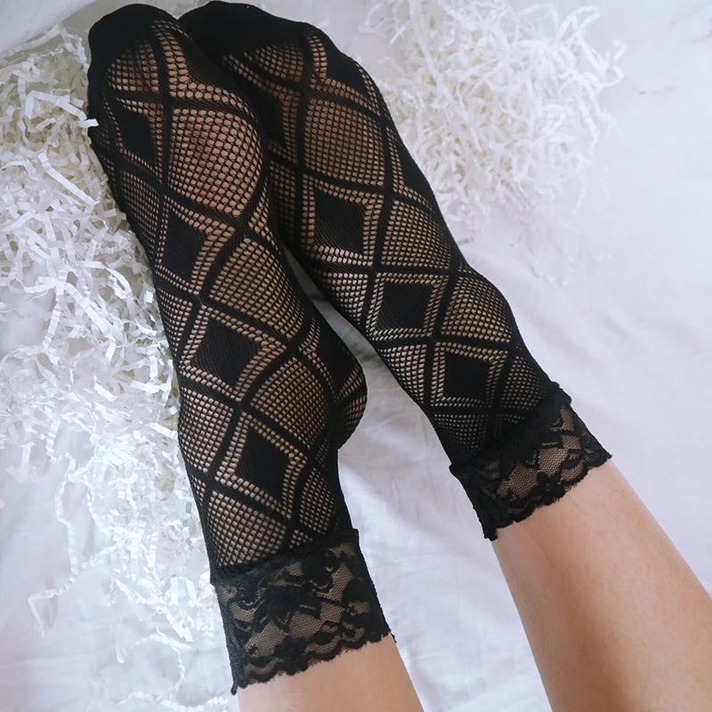 Черные кружевные женские носки Kawaii Ажурные крючком женские носки Лолита Стиль Короткие ажурные прозрачные носки для женщин