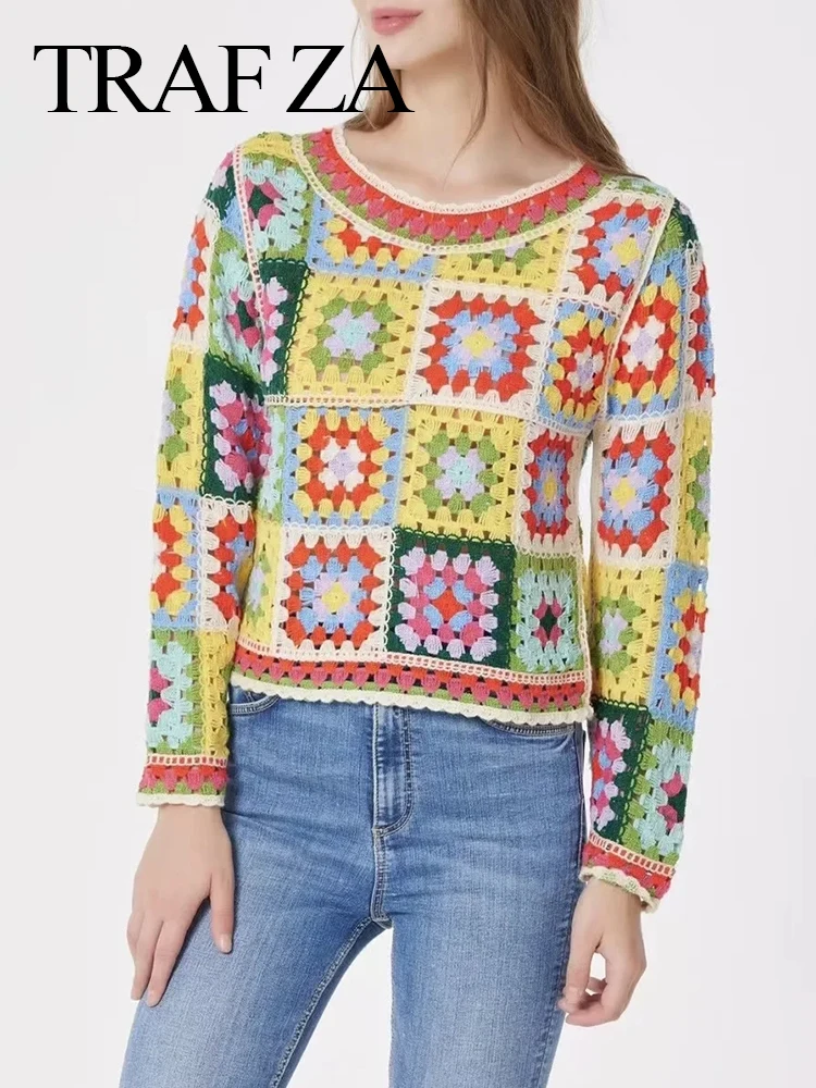 TRAF ZA Two Tone One Size Loose Fashion Crew Neck Women Pullover Sweater Colorful Square Patchwork Pattern Lady Knit Sweater