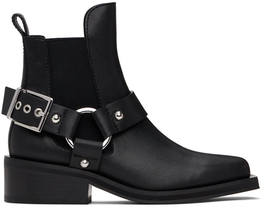 Черные низкие байкерские ботинки челси. Черные сапоги из зернистой искусственной кожи до щиколотки.Квадратный носокПетля на пяткеРемень с пряжкой на щиколоткеЭластичная ластовица по бокамМногослойный каблук из искусственной кожи с вставкой каучукаПодошва из искусственной кожи с вставкой каучукаСеребристая фурнитура с выгравированным логотипомКаблук: H1,75"Цвет поставщика: Черный Верх: синтетика. Подошва: синтетика, резина. Производство Португалия.