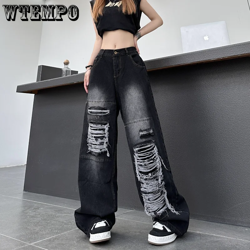 Черные рваные джинсы с высокой талией для женщин, винтажная одежда Y2k, модные прямые джинсовые брюки, уличная одежда, джинсы в стиле хип-хоп с дырками