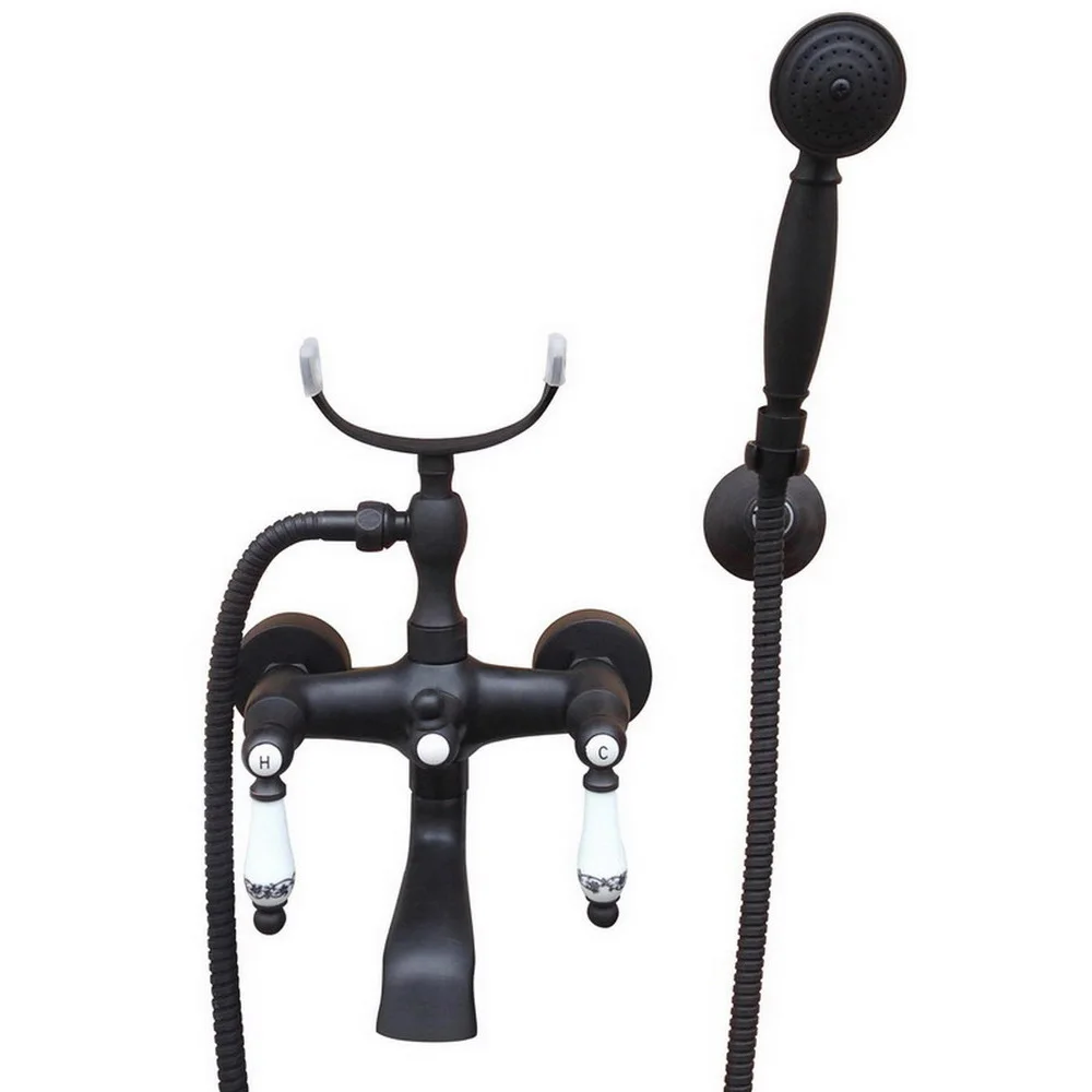 Черный латунный кран с двумя керамическими ручками, настенный кран-Лапка для ванной комнаты, кран-смеситель с ручным душем mtf604