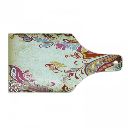 Colorful Cutting Board Flower Bouquet Paisley Pattern Floral Damask Persian Print Decorative Tempered Glass Cutting and Serving Board Wine Bottle Shape Grey Yellow and Multicolor by Ambesonne