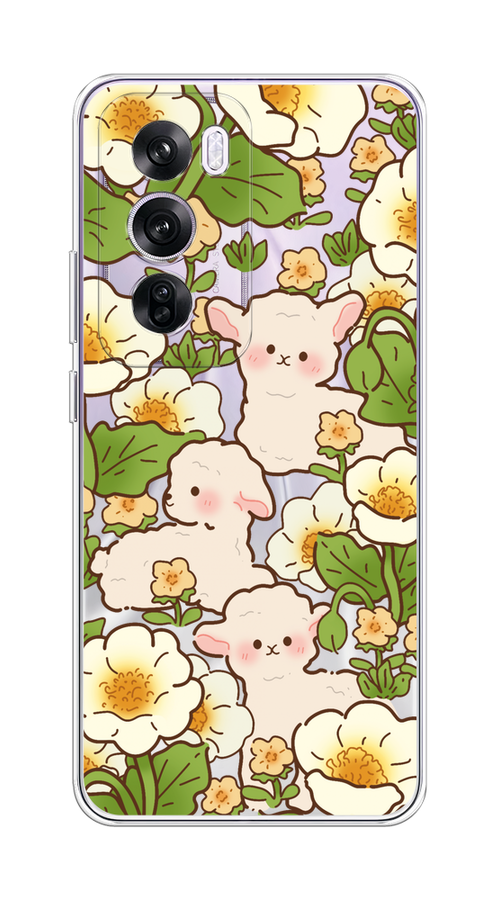 Чехол на Oppo Reno 12 Pro "Овечки в цветах", Зеленый;бежевый, 2517150-1