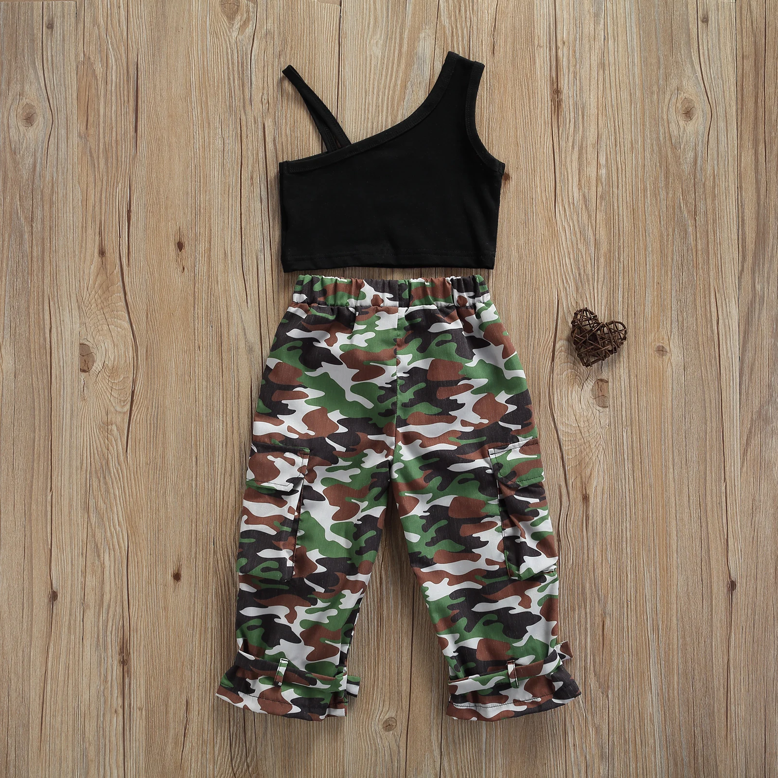 Girls Casual Two-piece Clothes Set, Black Sleeveless Off-the-shoulder Tops and Camouflage Printing Pants
