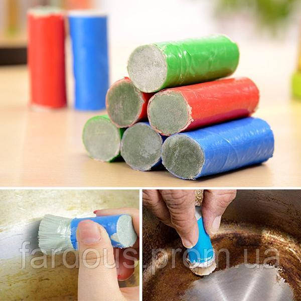 Сборка заказа и отправка: в течении 1-3 рабочих дней после поступления оплаты (кроме сб, вс). ТТН сбрасываем на Е-МЕЙЛ после 19:00 часов или утром следующего дня. Условия доставки и оплаты - нажмите ЗДЕСЬ , Решение спорных вопросов - нажмите ЗДЕСЬ , посылку проверяйте на почте!Посмотреть весь ассортимент товаров нажмите ЗДЕСЬКарандаш для чистки посуды - представляет собой тысячи тонких металлических волосков, которые плотно соединены в пучок пленкой. Благодаря тому, что волоски очень тонкие, с помощью карандаша без труда можно очистить застарелую грязь на поверхности любой посуды.Тонкие и гибкие металлические волокна удаляют грязь и при этом не повреждают поверхность посуды. Карандаш можно использовать для чистки сковородок с тефлоновым покрытием, эмалированных кастрюль, посуды из нержавеющей стали и другой кухонной утвари.Инструкция по применению карандаша для чистки посудыПеред началом использования карандаша необходимо немного надрезать цветную оболочку и высвободить кончики волосков. После этого карандаш следует намочить чистой водой и приступать к чистке посуды.Для большей эффективности посуду можно чистить под струей воды. Обратите внимание, что проделывать процедуру стоит в перчатках, чтобы обезопасить кожу рук от повреждения металлическими волокнами.ПримечанияНе снимайте с карандаша цветную пленку сразу, постепенно освобождайте металлические волоски от оболочки по мере их истирания;После использования тщательно промойте чистой водой;Храните в сухом месте.ХарактеристикиМатериал: нержавеющая сталь, ПВХ;Размер: длинна 7 смКоличество в упаковке: 2 шт
