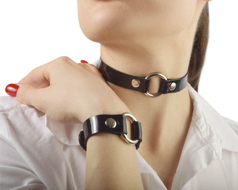 Чокер из натуральной лаковой кожи черного цвета, украшен металлическим кольцом. Регулируется при помощи кнопок. Длина чокера 40 см, ширина 1,5 см. Металлическое кольцо имеет никелевое покрытие. Масса нетто 20 гр.