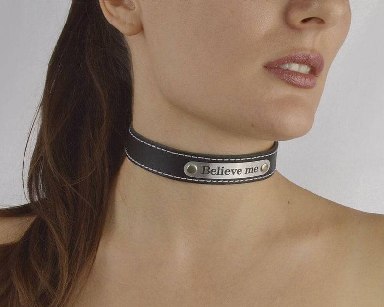 Чокер изготовлен из натуральной кожи и дополнен вставкой под металл с надписью Believe me. Регулируется при помощи кнопок. Общая длина 41 см.
