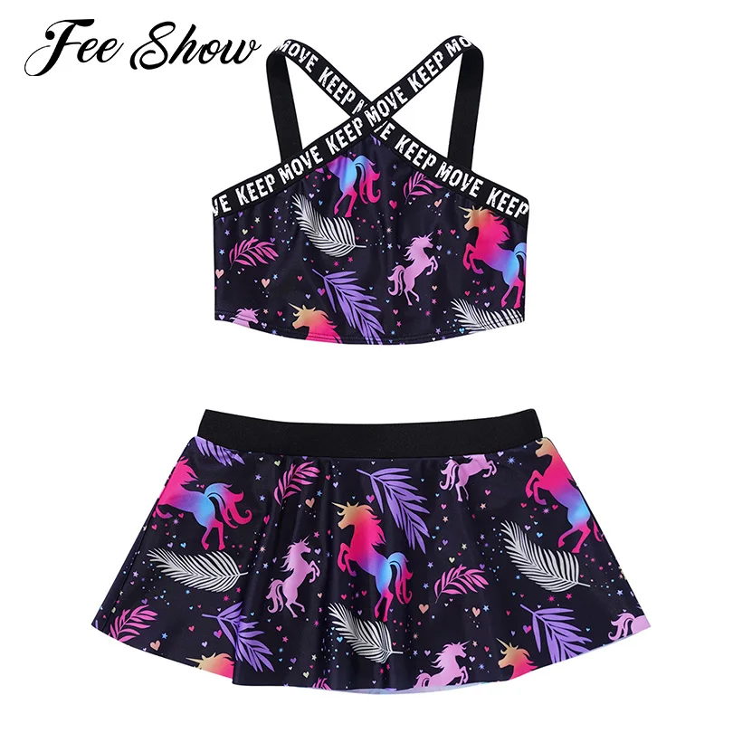 Summer Fashion Kids Girls Two Pieces Tankini Suits Swimwear Cross Straps Swim Top+Skirted Shorts Set Bathing Swimsuit Beachwear