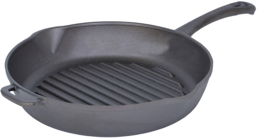 круглая сковородка-гриль чугунная очень быстро прожаривает продукты и оставляет на их поверхности сетчатый узор и аппетитную золотистую корочку.