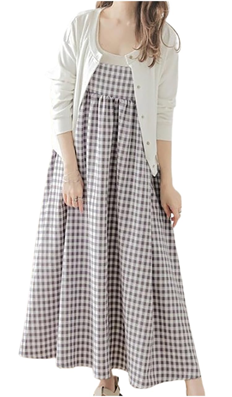 Чунначи Клетчатая майка Гингем Свободная Идеально для повседневной носки Всю длину Клетка Идеально для и Ужина Серое клетчатое платье, С высокой талией, Стройнящее,