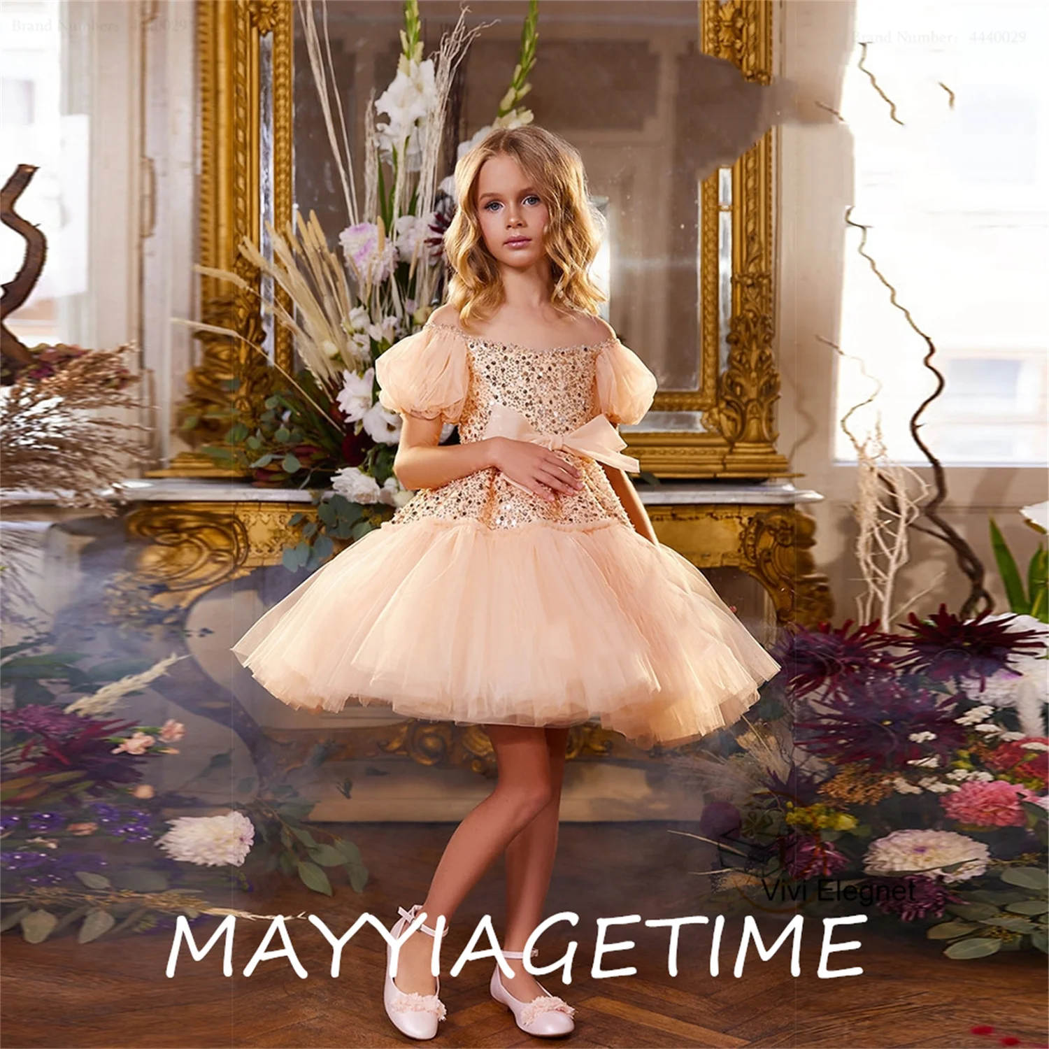 Шампанское Многоярусное платье для девушек с открытыми плечами и цветами, Тюлевое платье-пачка с блестками и бантом, танцевальные свадебные платья для девушек