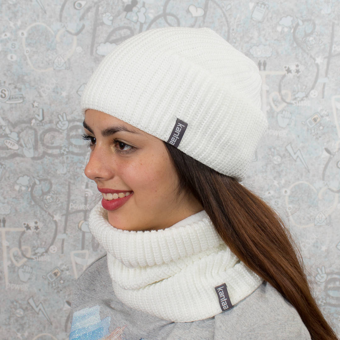 Шапка Женская Вязаная - Комплект Бини на флисе белый