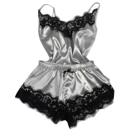 TruPeony Women Sleepwear Sleeveless Strap Nightwear Lace Trim Satin Cami Top Pajama Set