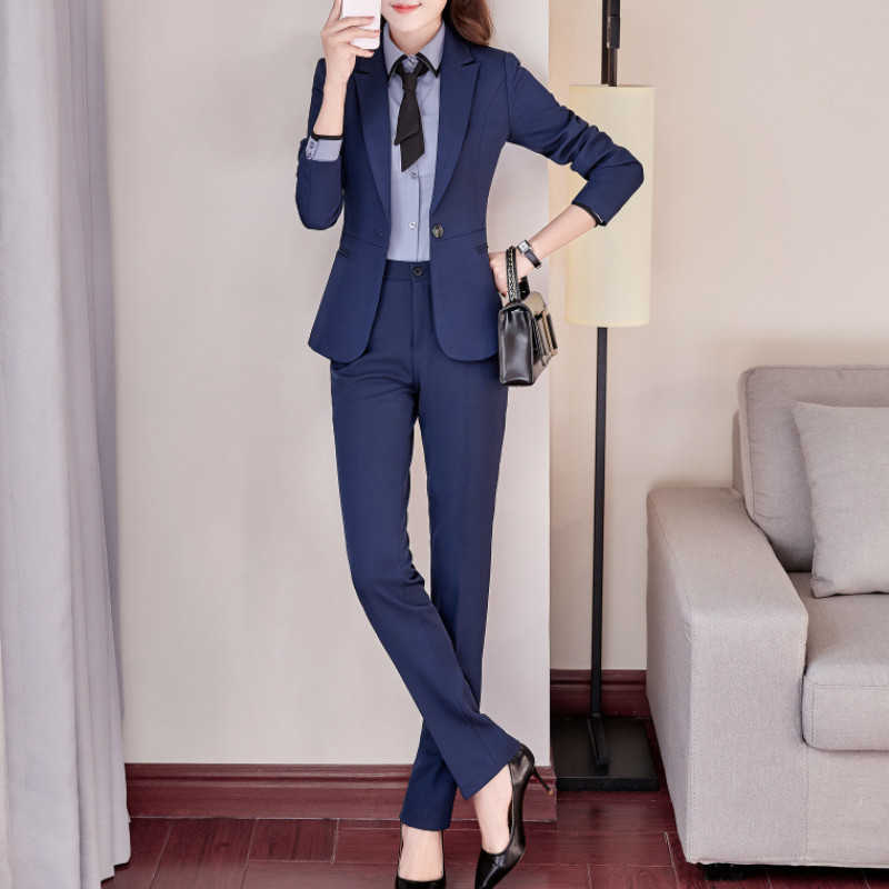 High quality winter women' suit Temperament casual long-sleeved slim large size blue blazer Pants office female 210527, Two-piece set-a