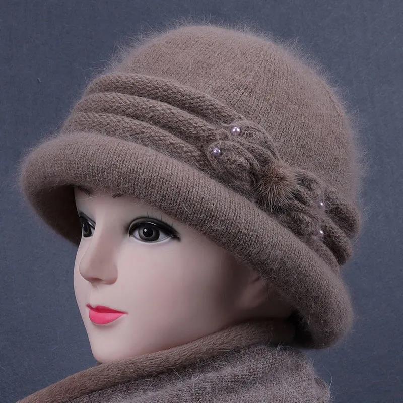 Шапка женская зимняя пожилая из кроличьего меха вязаная теплая шерстяная шляпа-чаша из плотного хлопка цилиндр one size коричневый