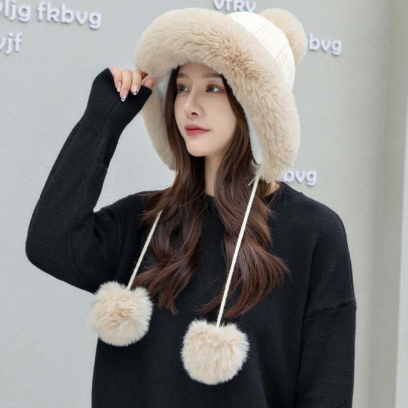 Шапка женская осенне-зимняя теплая вязаная шерстяная шапка милая дикая толстая теплая корейская версия плюшевой шапки Tide One size