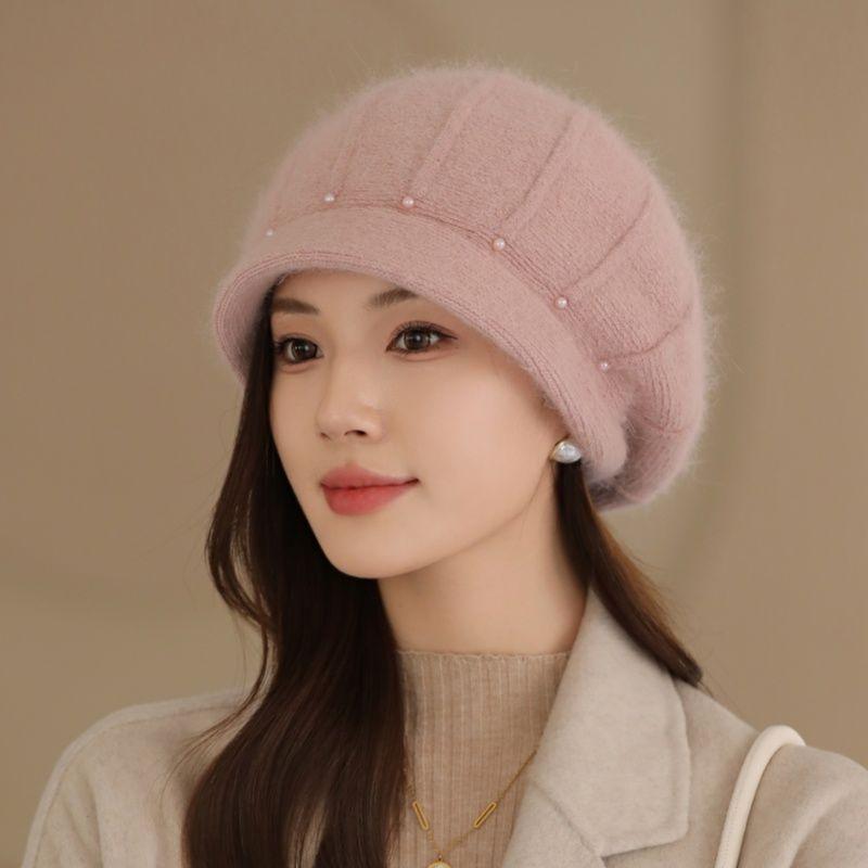 Шапка из кроличьего меха для людей среднего и пожилого возраста, универсальная зимняя теплая утолщенная беретка с козырьком, вязаная шерстяная шапка для защиты от холода one size 55-59cm розовый