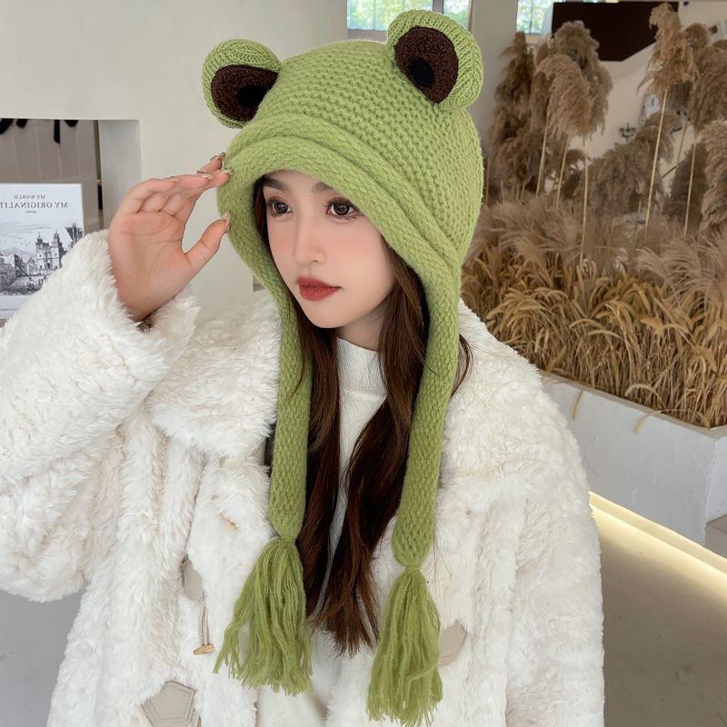 Шапка-лягушка, женская вязаная шапка, зимняя теплая, с кисточками, зимняя защита ушей, носок, зеленая шерстяная шапка one size зелёный