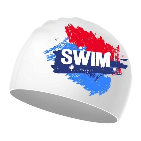 Шапочка для плавания Высокоэластичная водонепроницаемая Очень мягкая нескользящая конструкция Сверхлегкая защитная быстросохнущая шапочка для плавания с принтом Защитные шапочки для ушей для женщин белый/синий