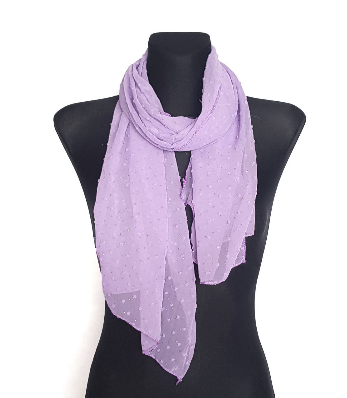 Очень нежный и красивый шарф дополнит образ каждой женщины . Изделие выполнено из легкой шифоновой ткани, на полотно нанесен нежно поблескивающие точки, добавляющие нарядности.