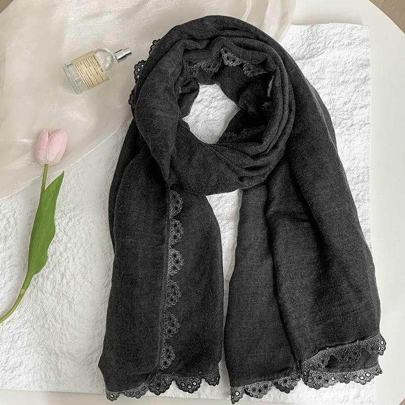 Шарф атмосфера весна и осень новая мода однотонный кружевной край защита шеи длинный вязаный шарф шаль темно-серого