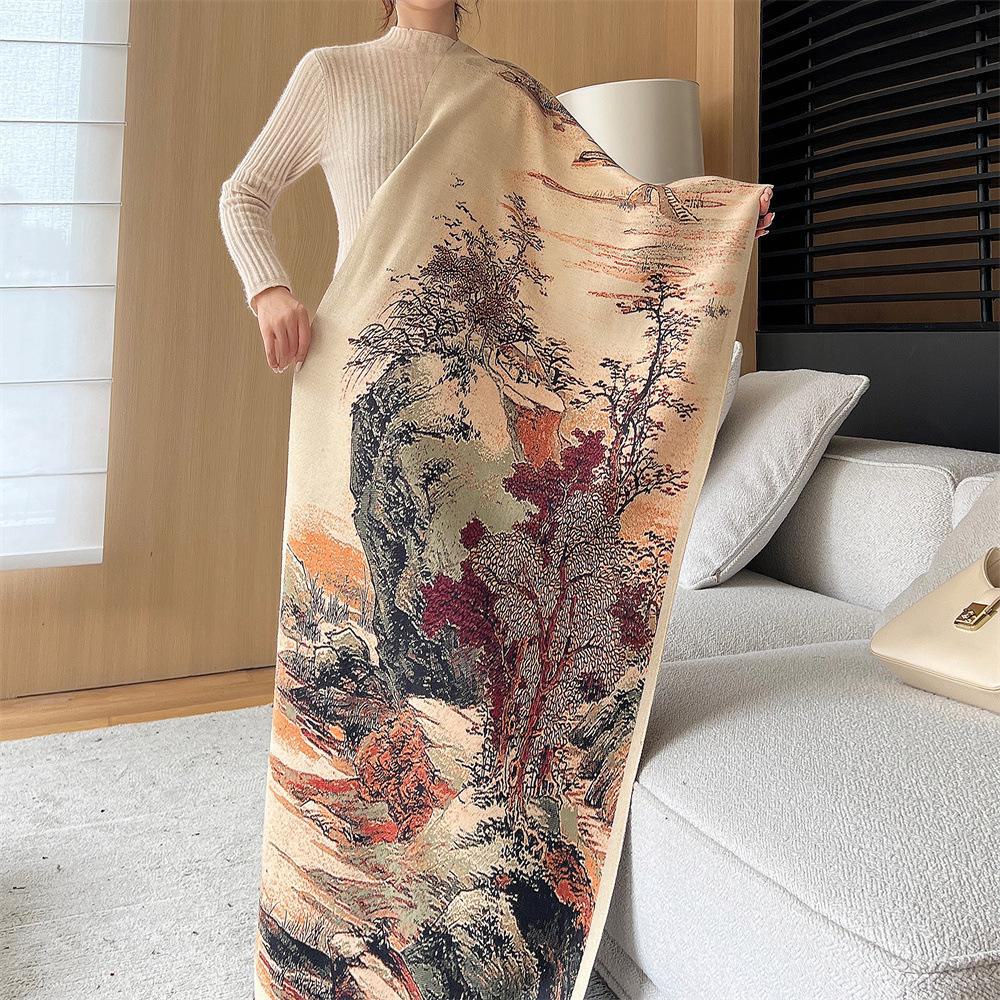 Шарф с пейзажем в этническом стиле, масляная живопись - мода на осень/зиму для студенток, теплая шаль из искусственного кашемира Tongguan Pushue Series; 190—65CM