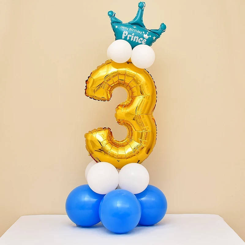 Шар цифра 3 золото с шариками и голубой короной