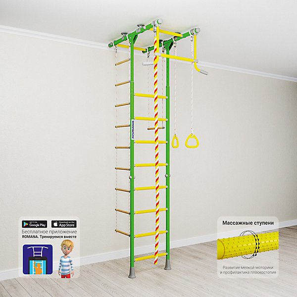 Шведская стенка Kometa 1 Romana зеленое яблоко — функциональный спортивный комплекс для ребенка, который поспособствует его физическому развитию, тренировке мышц, координации, равновесия. Устанавливается стенка при помощи креплений в распор: между полом и потолком. Такие крепления не требуют сверления и позволяют менять место стенки в квартире или комнате.