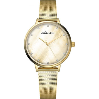 Женские кварцевые часы. Надежный швейцарский механизм Ronda 763. Центральные часовая, минутная и секундная стрелки. Золотистый перламутровый циферблат украшен кристаллами в местах часовых меток. Круглый корпус выполнен из матовой нержавеющей стали с PVD покрытием цвета желтого золота. Диаметр корпуса составляет 34 мм, толщина 7,5 мм. Стальной браслет с покрытием выполнен в технике миланского плетения, раскладная застежка. Прочное минеральное стекло устойчивое к мелким механическим повреждениям. Водостойкость WR 30 (брызги).