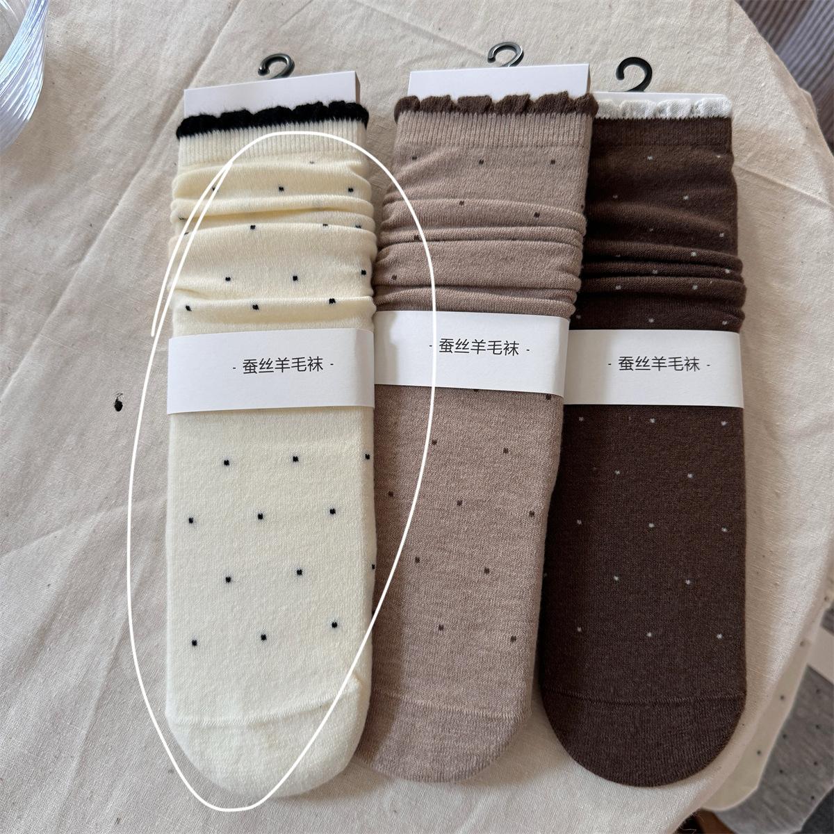 Шелковые и шерстяные носки в горошек, толстые и милые для осени и зимы, бесшовные махровые носки для девочек, носки до середины икры 1 pair молочный белый