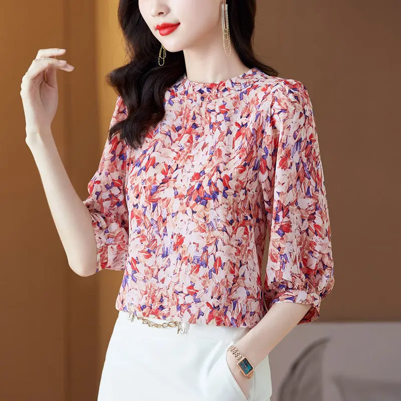 Шелковый топ с короткими рукавами и цветочным принтом, новинка весны и лета 2022, рубашка с рукавами средней длины, Высококачественная Повсед...