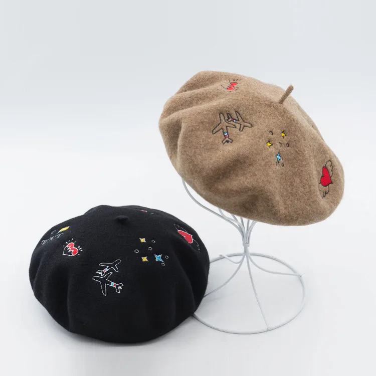 Шерстяная вязаная шапка для взрослых X190, женские шерстяные береты с вышивкой, шапки, женские Зимние Повседневные шапки с мультяшной вышивкой