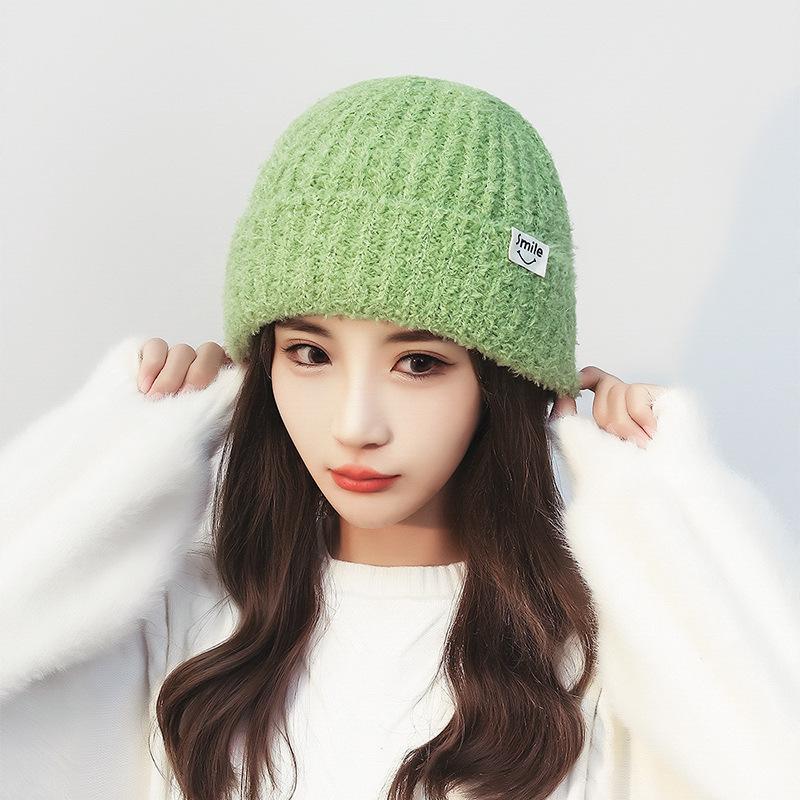 Шерстяная шапка женская зимняя милая теплая вязаная шапка с изображением смайлика однотонная большая шапка зелёный