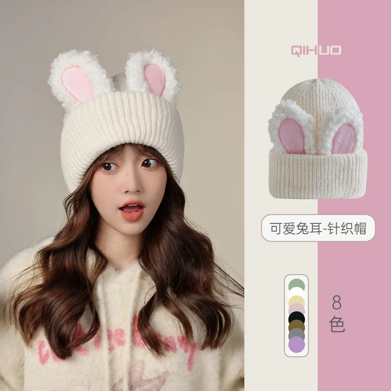 Шерстяная шапка с заячьими ушками Женская милая осенне-зимняя теплая вязаная шапка зимняя шапка с ушами