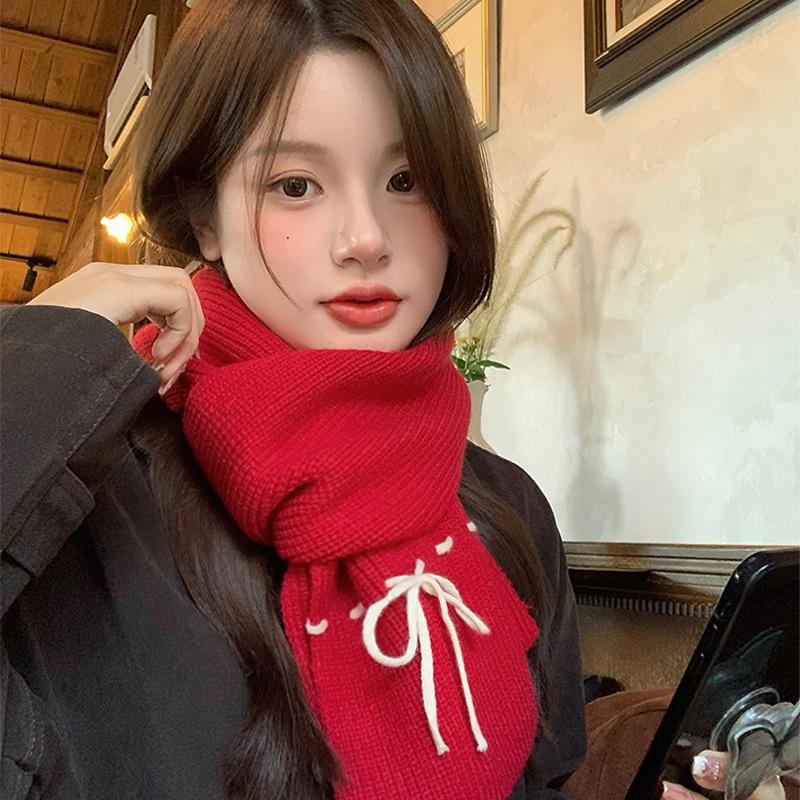 Шерстяной шарф с красным бантом в корейском стиле для женщин на осень и зиму, утолщенный, теплый, для защиты шеи, вязаный платок-шарф, зимний 180*17cm
