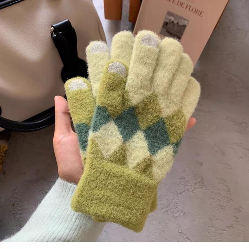 Шерстяные теплые перчатки для женщин на осень и зиму с сенсорным экраном для езды на велосипеде, милые зимние для велоспорта, для студентов, с пятью пальцами, плюс бархатные вязаные перчатки 1pairs зелёный