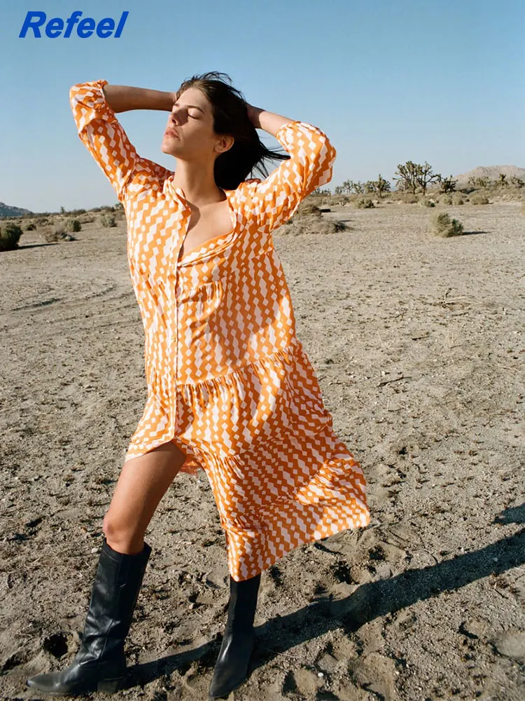 Women Summer Plaid Dresses Oversize Elegant Party Single Breasted Dress Vintage Long Sleeve Female V-neck Loose Outwear 22627
