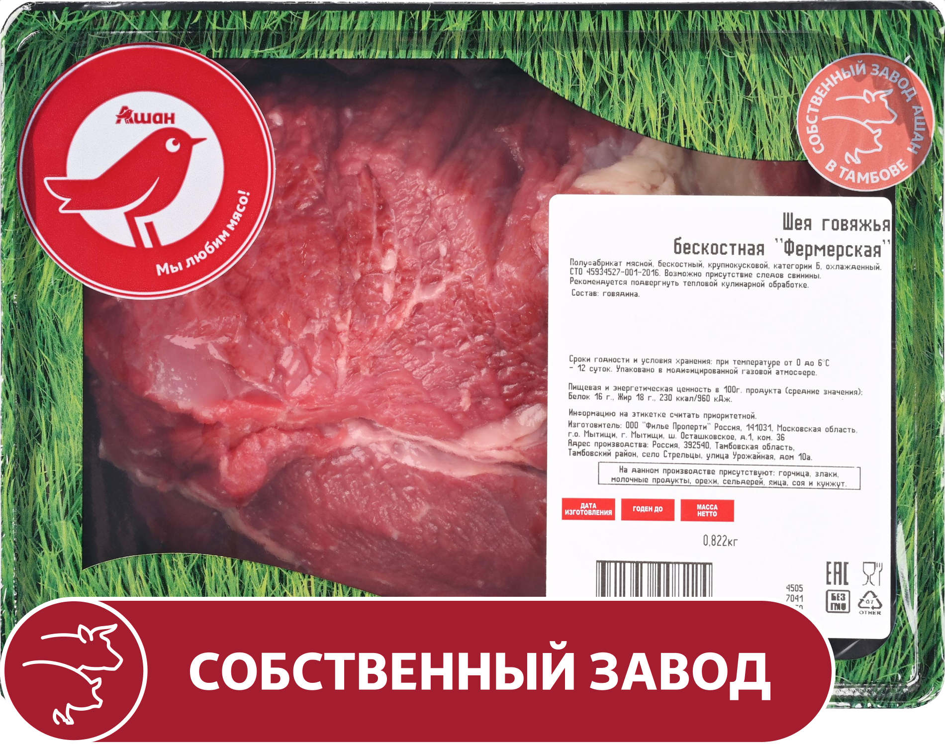 Шея говяжья АШАН Красная птица фермерская бескостная охлажденная, 1 упаковка ~ 1,2 кг