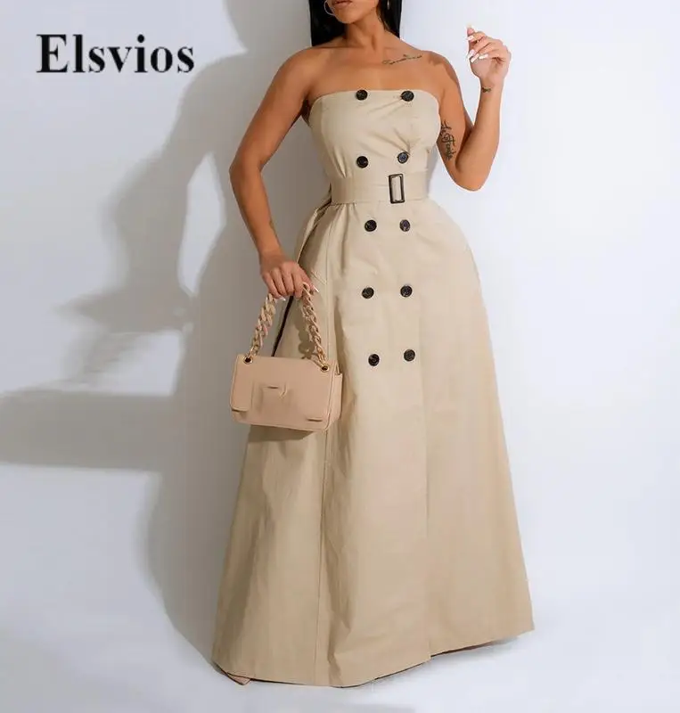 Шикарное облегающее модное платье во французском стиле с поясом, элегантное платье без бретелек с открытыми плечами, женское однотонное длинное ТРАПЕЦИЕВИДНОЕ ПЛАТЬЕ НА ПУГОВИЦАХ